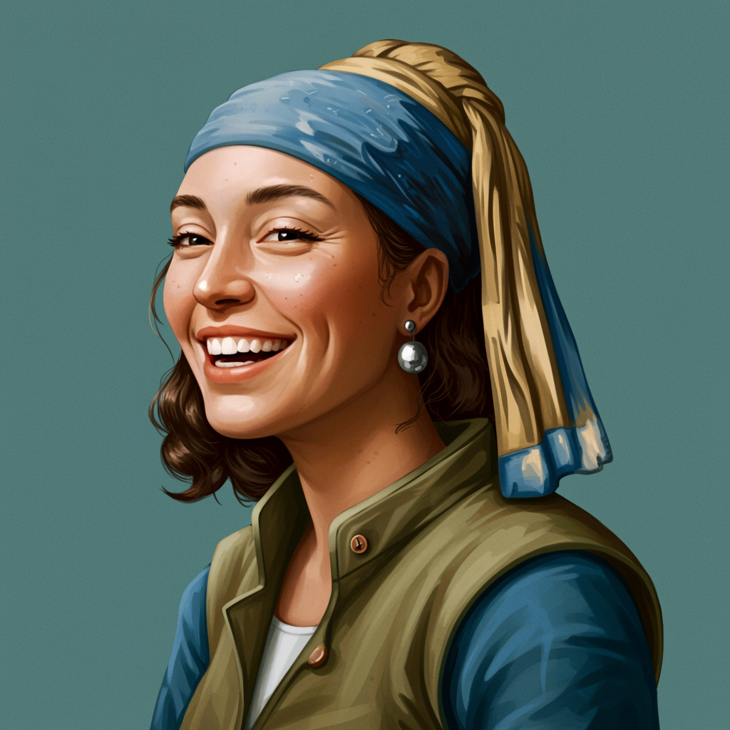 A joyful woman with a pearl earring, draped in shades of blue and khaki, radiating meticulous attention to detail, embodying a solarpunk spirit and li-core essence, her warm smile reflecting harmony and optimism.