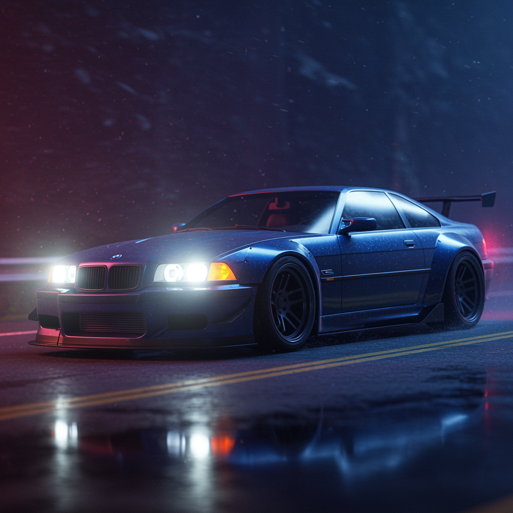 Sport car, shimmering metallic midnight blue paint, aggressive stance, finely tuned, fusion of BMW and Corvette design, full view, captured in motion, high velocity, cinematic chase scene, glistening wet road, underground racing culture, moody and dark ambience, piercing bright headlights, neon-infused cyberpunk style, atmospheric Blade Runner feel, cinematic cover art, full frame of a singular sport car, intricately designed, highly detailed digital artwork, showcased on ArtStation, concept art, superior quality masterpiece, hyper-realistic, exceptionally detailed, sharp focus, 8k resolution, HDR quality, shallow depth of field, broad lighting, high contrast backlight, enhanced bloom effects, sparkling highlights, subtle chromatic aberration, flawlessly focused, untouched RAW color capture, unique modifications, preserving core theme.