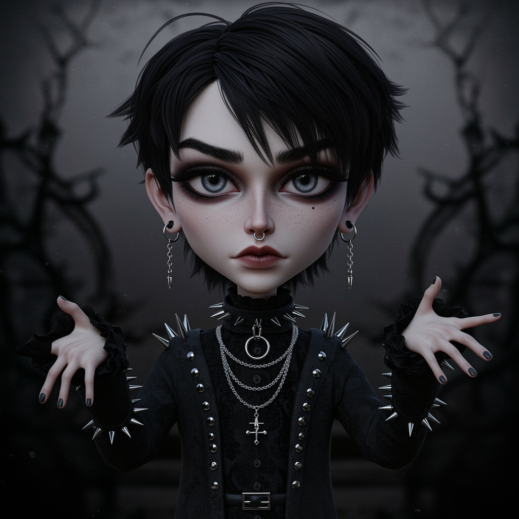 A brooding dark-haired boy with gothcore aesthetics, portrayed in a hyper-stylized, exaggerated caricature form reminiscent of ZBrush creations, set in a high-contrast, surreal landscape. His outfit is a fusion of Victorian and punk influences, adorned with intricate silver jewelry and spikes, capturing the essence of rebellion and mystery. His expressive eyes convey a sense of depth and intrigue, completing the image of a character caught between shadows and the allure of the unknown.