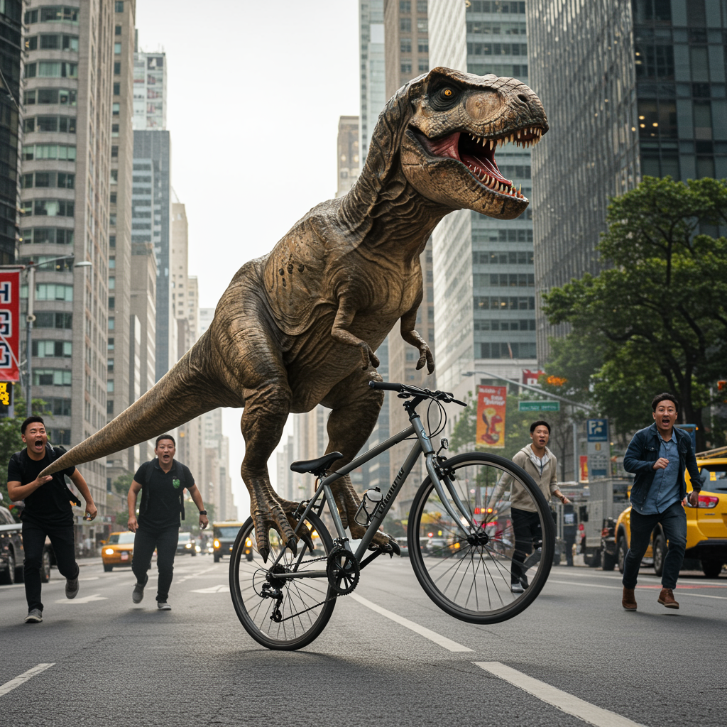 A lifelike Tyrannosaurus rex expertly balancing on a bicycle, with its powerful legs pedaling furiously, while nearby terrified onlookers in modern city attire sprint in different directions, their faces filled with panic and their voices echoing screams that reverberate through the urban landscape as the chaotic scene unfolds against a backdrop of towering skyscrapers and bustling streets.
