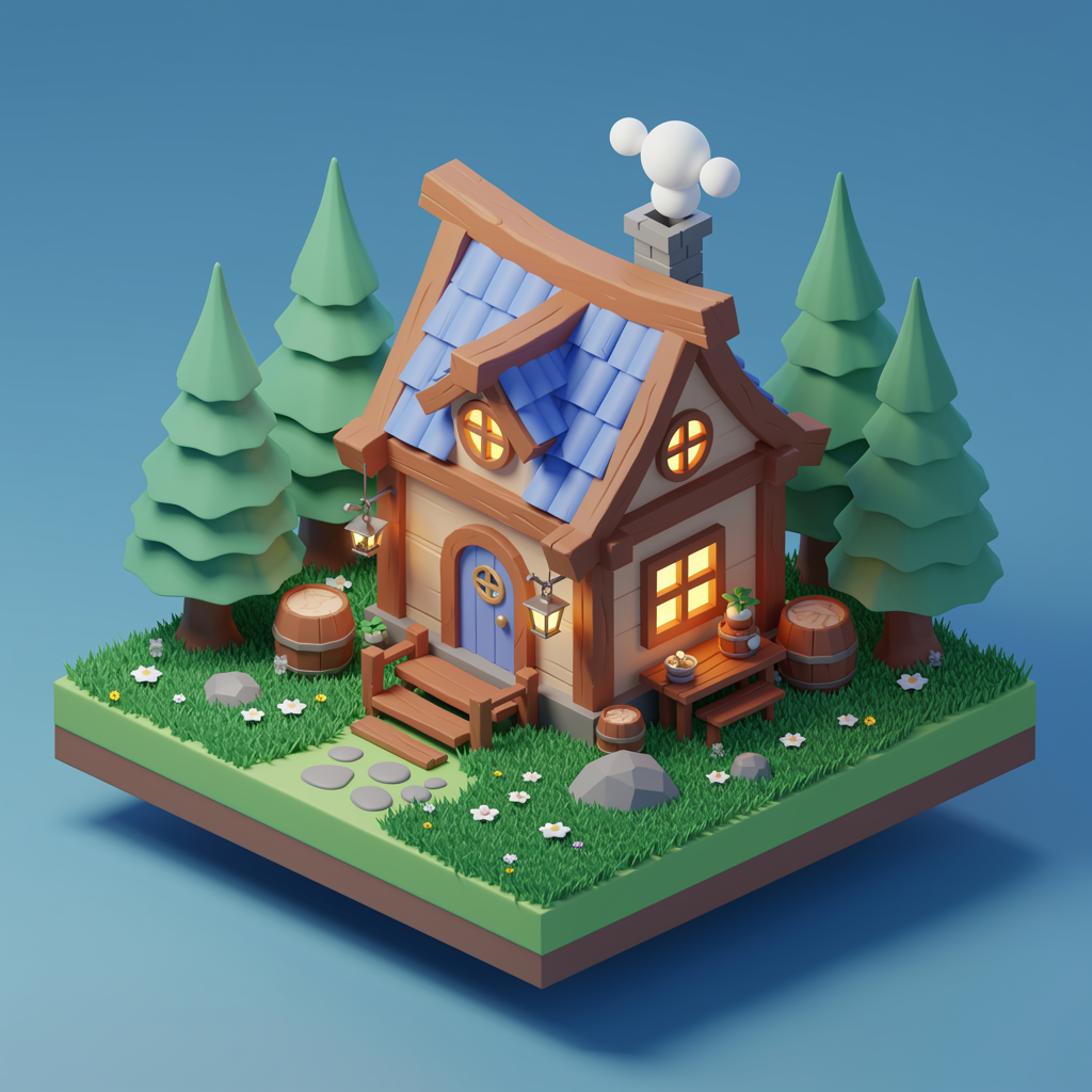 Tiny whimsical isometric fantasy cabin nestled in a lush forest, beautifully detailed with charming decorations, bathed in gentle, soothing lighting, featuring a palette of calming pastel colors, captured with a 100mm lens, crafted in 3D blender style, popular on polycount, inspired by modular constructivism, set against a serene blue background, utilizing physically based rendering techniques, perfectly centered, enhanced with volumetric lighting, evoking a playful cartoon and anime aesthetic, complete with sketch-like elements, evoking an artistic flair, rendered with a soft focus to create a magical low-resolution atmosphere while maintaining a captivating normal quality.