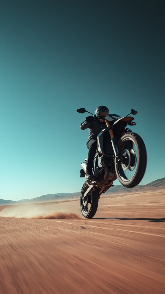 A young man navigating a sleek electric dirt bike across the expansive desert landscape, outfitted in all-black attire. The scene showcases an expensive carbon fiber futuristic electric motorbike, entirely battery-powered. Photographed from a low angle in a wide scenic shot, this contemporary image captures the essence of modernist photography with a focus on high-speed dynamics. The rider performs an impressive wheelie, enhanced by intentional motion blur. Captured in 8k Ultra HD, the moody atmosphere is accentuated by professional color grading and atmospheric lighting. A polarizing filter enriches the dark blue sky, creating a visually sharp and vibrant scene, free from any vignette or unnecessary cropping. Conspicuously absent are elements of the mundane or outdated, eschewing combustion or petrol engines for a purely electric experience.