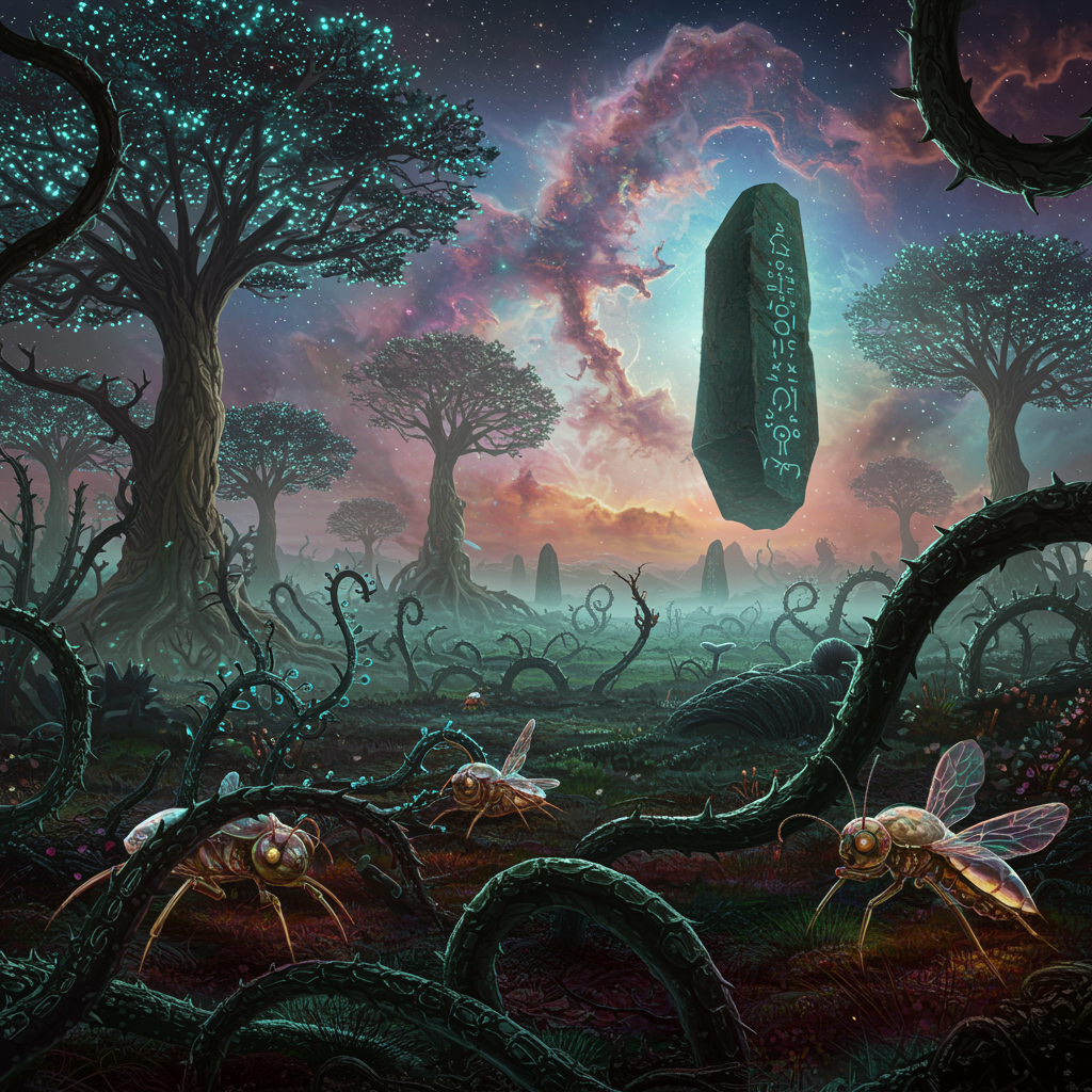 A surreal landscape unfolds before you, featuring towering, bioluminescent tree-creatures with iridescent leaves that whisper secrets to each other. In the sky, swirling nebulae form peculiar animal shapes, their colors blending and shifting in mesmerizing patterns. On the ground, metallic vines slither and pulse with an eerie glow, while crystalline insects with transparent shells and exposed, intricate gears flit about, feeding off the vines' electric hum. A colossal, levitating monolith, carved with cryptic symbols, casts an unsettling shadow over the scene, throbbing with an otherworldly energy that seems to distort time and space around it.