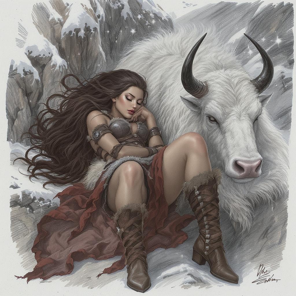 A breathtaking color sketch of a strong and beautiful barbarian warrioress with fierce, expressive brown eyes and long, tousled dark brown sable hair. She sleeps contentedly beside her majestic white war yak against a backdrop of a snowy mountain ledge path. Her skin is tan, and she is clad in armor and boots made of rugged brown leather and fur. The scene is illuminated with volumetric and dynamic lighting, capturing the essence of a hyperrealistic, photorealistic, and hyper-detailed maximalist masterpiece. The artwork embodies an enchanting dark romance fantasy, with each element perfectly composed to convey strength, serenity, and an otherworldly beauty.
