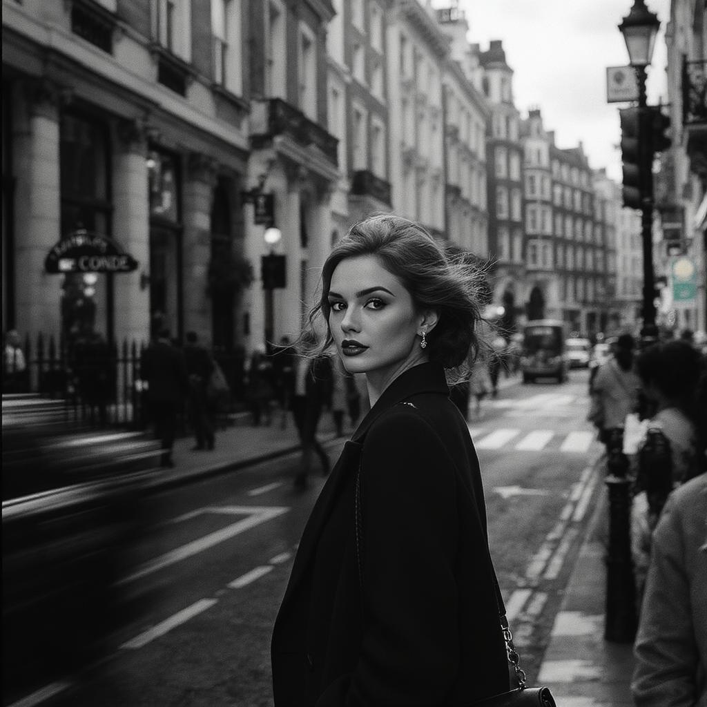 Elegant black and white street portrait of a captivating woman navigating the bustling streets of London, captured with an Arriflex 35 BL and Canon K35 Prime Lenses. The scene embodies a dynamic energy and classic allure, with playful elements of urban chaos. The tall buildings provide a dramatic backdrop as people blur into motion around her, emphasizing her poised and confident presence. Light and shadow interplay gracefully, accentuating the timeless charm and architecture of the city. The composition is elongated, emphasizing the vertical expanse and rich textures of London’s iconic streetscape, evoking a sense of refined style and narrative depth.