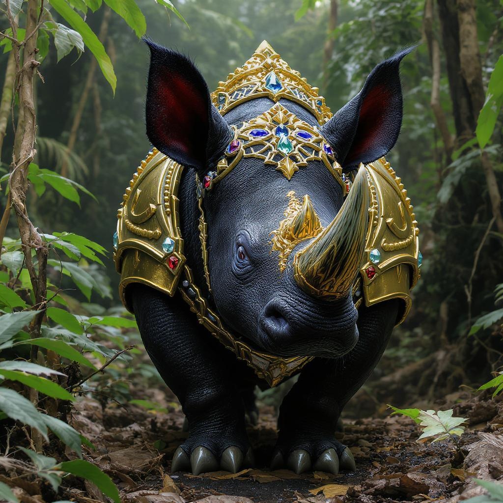 A majestic black bat rhinoceros roams the vibrant Amazon forests, adorned in resplendent gold knight armor. Its piercing blue eyes glint with intelligence, while elaborate crystal jewelry sparkles upon its formidable frame. Its helmet is a masterpiece of artistry, adorned with intricate ornaments and bright, colorful pebbles that glisten in the dappled sunlight. The striking contrast and high saturation of the scene bring every fine detail of this regal creature to life, capturing the essence of both fantasy and the wild with breathtaking realism.