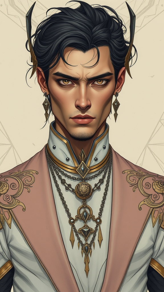 A surreal male character design inspired by the Krull movie, blending the artistic styles of Sergio Toppi and George Barbier. The character embodies sci-fi motifs with elements of hyperrealism and minimalism, displaying a photorealistic appearance. He exudes a rebelcore essence, characterized by a distinctive, ethereal presence that melds elaborate linework with art deco influences. The attire features futuristic elements juxtaposed with elegant, rebellious touches, maintaining a balance between intricate detail and minimalist form. His gaze is intense and otherworldly, reflecting a world where fantasy and reality converge seamlessly.