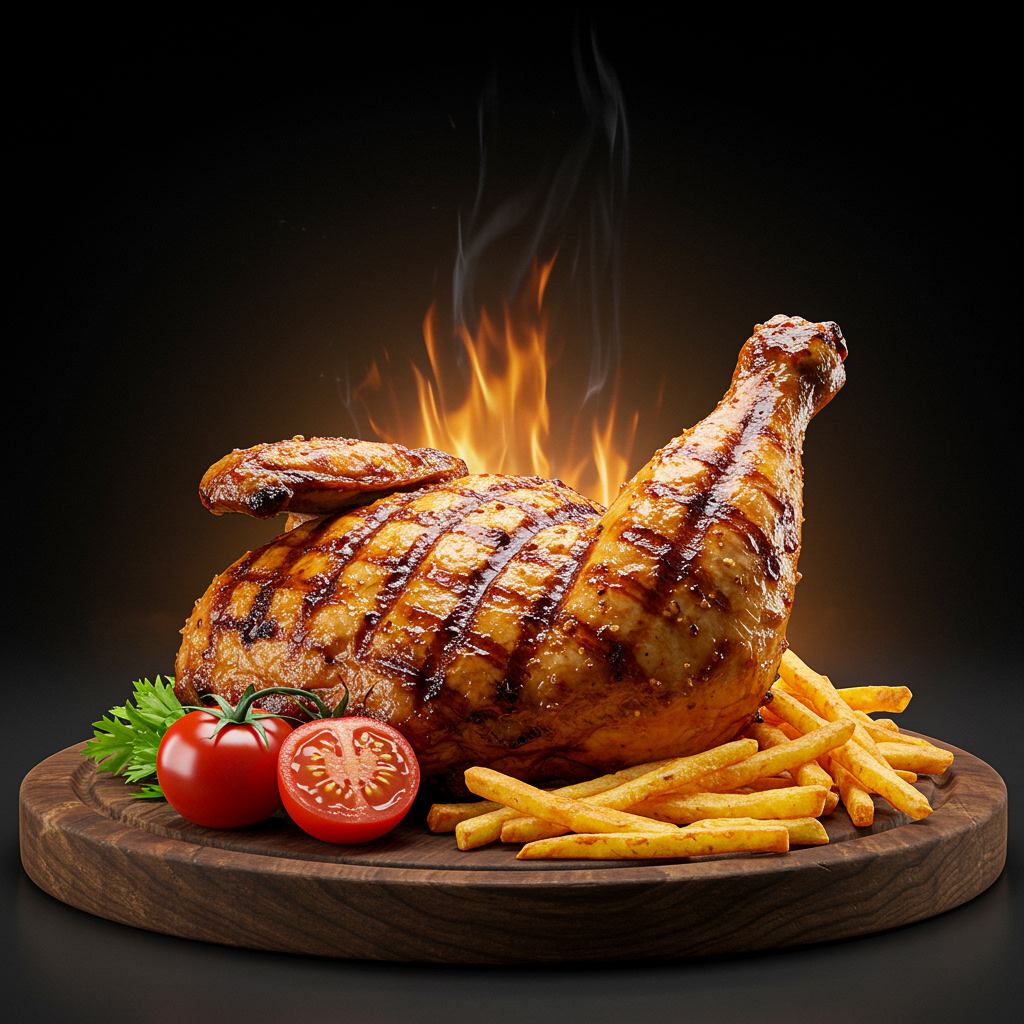 Deliciously grilled chicken presented as a tantalizing food photograph, meticulously styled to perfection. Captured from a wide perspective using a prime 85mm lens at f/11, this studio shot boasts ultra-high detail rendered in octane. The image, in stunning 8k resolution, plays with a subtle change in the aspect ratio to 3:4, enhancing the visual appeal.