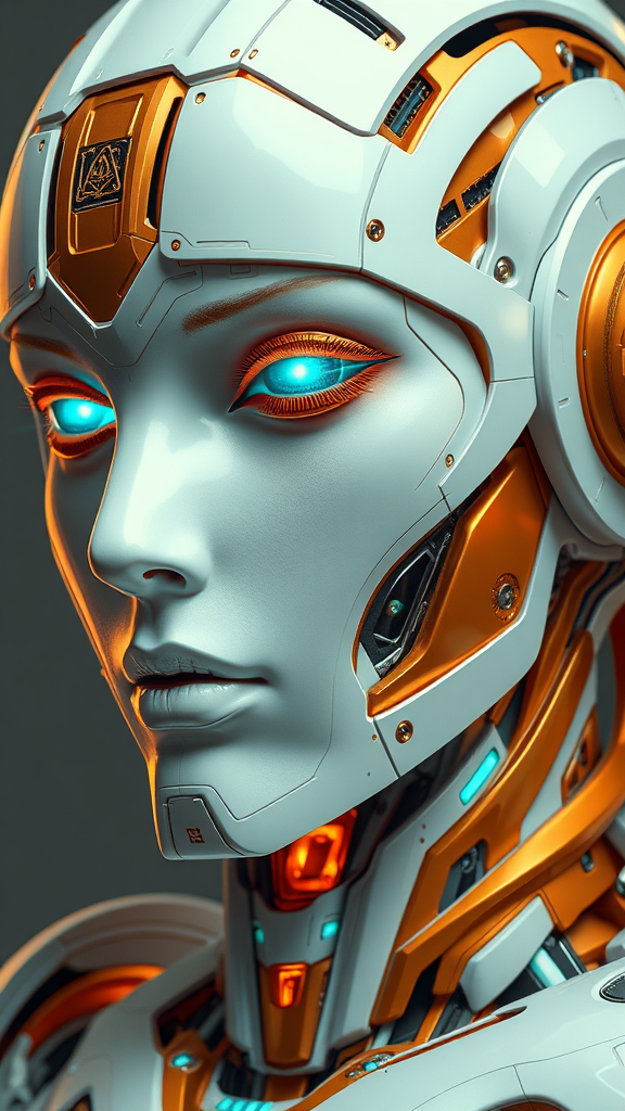 Sci-fi fantasy artwork featuring a stunning robot, focusing on realistic hyper-detailed portraiture. The color palette consists of deep white and vivid orange, inspired by classicist portrait styles. Elements of dark gold intertwine with aquamarine highlights, showcasing intricate realist details. The piece is characterized by hard-edged design, reflecting technological marvels, while retaining an elegant and timeless quality.