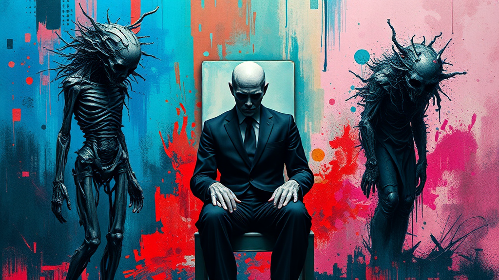 A surreal, abstract artwork features three enigmatic figures. The central figure is seated, clad in an inky black suit, with an eerie, faceless head cloaked in shadow. The left figure is a distorted humanoid, its intricate textures and layers merging fluidly with the background. On the right, a hunched form in dark garb appears, fragmented and chaotic in its presence. The background vibrantly shifts between electric blue, fiery red, lush green, and soft pink, interspersed with digital glitches and sweeping abstract strokes. The style is intensely expressive and emotionally charged, with a visually fragmented aesthetic, heavy textures, and bold, striking colors.
