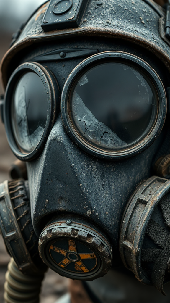 A detailed close-up of a Chernobyl liquidator's gas mask, dominating the frame with its gritty, realistic texture. This authentic Soviet-era design features slightly cracked, rounded lenses, robust rubber seals, and sturdy straps, all coated in a grimy mixture of ash and reactor fallout. The mask's aged surface tells a story of resilience, with subtle patches of rust and wear, hinting at the harsh environment it has endured. The background is a blurred hint of the desolate landscape, evoking a sense of haunting silence amidst the chaos.
