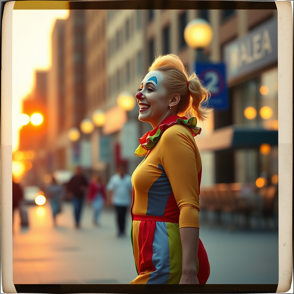 A cheerful clown in a colorful harlequin outfit walks through the city at sunset, her bright pigtails bouncing with each step. The happy woman radiates pure joy, her smile captivating anyone who catches a glimpse. The side view captures her infectious spirit as she strolls, framed by the enchanting glow of volumetric lighting. The scene has the nostalgic charm of a polaroid photo, capturing a moment of urban whimsy and delight.