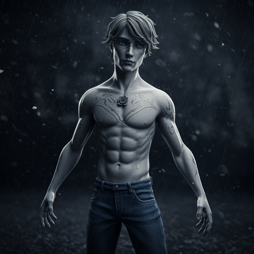A breathtaking digital masterpiece of the world's most stunning artwork featuring a graceful and enigmatic male hero. This full-body 8k unity render captures an action shot with remarkable detail, highlighting the intricacies of skin pores. Set against a backdrop of very dark lighting and heavy shadows, the scene is decadent and mysterious. The hero's detailed face is rendered with expert precision, reminiscent of works by Artgerm, WLOP, Ilya Kuvshinov, Greg Rutkowski, and Alphonse Mucha. In this captivating illustration, heavy rain falls around him, with particles gently floating in the dim light. The two-tone lighting casts a trim light over his form, accentuated by a subtle flower and facial marking. Clad in blue jeans, the hero exudes a timeless charm in this monochrome 3D render. Despite his doll-like, plastic beauty, there is a captivating blur and haze to the scene. His eyes convey an unclear depth, inviting introspection. The artwork seamlessly blends realism and fantasy, achieving a perfect balance in its harmonious proportions.