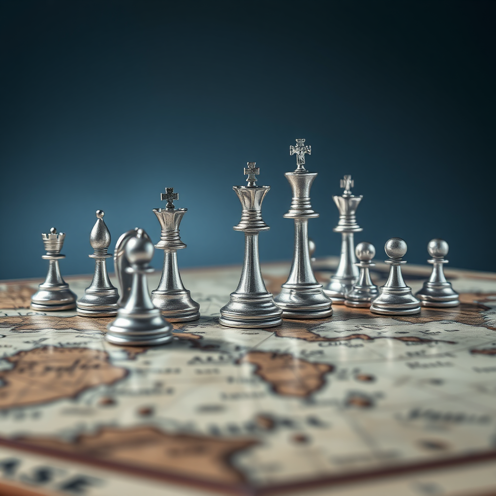 A captivating cinematic photograph showcases exquisitely crafted silver chess pieces, intricately designed and strategically arranged on a richly textured board, composed of vintage celestial maps that signify universal influence, strategic maneuvering, and intellectual prowess. Delicately crafted shadows and subtle reflections enhance the sense of depth, as the composition is set against a sleek, slate-blue background that fades into a soft, pearly white toward the horizon, evoking a feeling of sophisticated opulence and refinement. The maps' weathered, earthy colors contrast beautifully with the chess pieces' metallic luster, creating a stunning juxtaposition. The overall scene emanates elegance, precision, and the drama of high-stakes intellectual engagement.