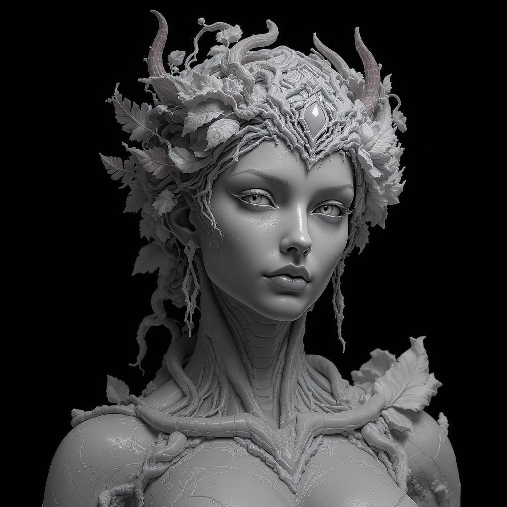 A hyper-realistic sci-fi sculpture of a woman in black and white, featuring an intricate crown adorned with detailed depictions of nature elements like vines, leaves, and flowers, designed in ZBrush style with a futuristic twist, her expression serene yet otherworldly, capturing the essence of nature intertwined with advanced technology, the textures and details so finely crafted they seem almost alive in monochrome elegance.