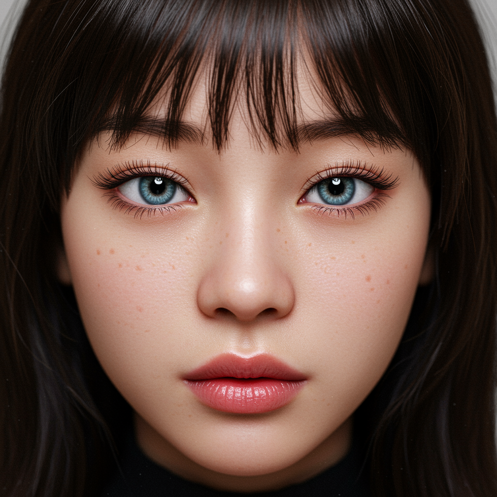 A stunning Korean woman, reminiscent of a K-pop idol, with perfectly symmetrical eyes, captured in an 8k ultra-high-resolution hyperrealistic photograph. Her face and eyes are beautifully detailed, showcasing the artistry of high-detail color photography. This professional photo, taken with a Nikon d850 using Cinestill 800 film, features physics-based rendering to achieve a lifelike appearance. The image boasts high contrast and meticulous detailing, with a nod to CGI and 3D elements, creating a harmonious blend of realism and artistry. While avoiding cartoon and anime influences, the digital art maintains its high quality without compromising on authenticity, focusing on a flawless complexion free from skin spots, acne, or blemishes, showcasing top-tier realism in an ultra-high-definition format.