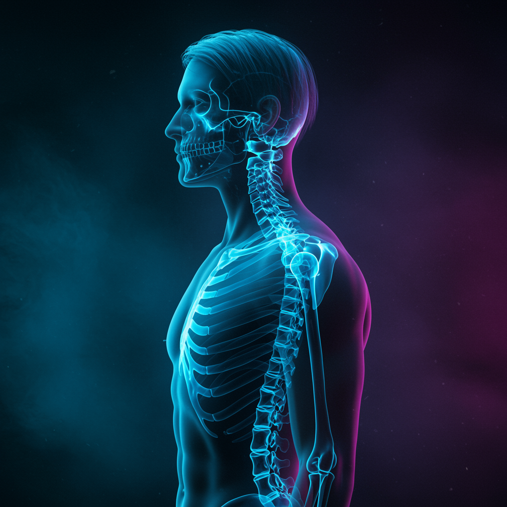 A futuristic surrealism-inspired portrait of a man from the side, displaying transparent skin that reveals skeletal structure, glowing with a neon-blue bioluminescent effect. He is dressed in minimalist avant-garde attire, surrounded by a dark, atmospheric environment that highlights the sharpness of his bones. The backdrop is a surreal, sci-fi setting with deep mist, while the lighting is soft, casting a cool future-like violet glow that subtly illuminates the skeletal details. Featuring translucent textures and cinematic lighting, the scene embraces cyberpunk aesthetics, with a focus on x-ray vision, futuristic materials, minimalism, and realism.