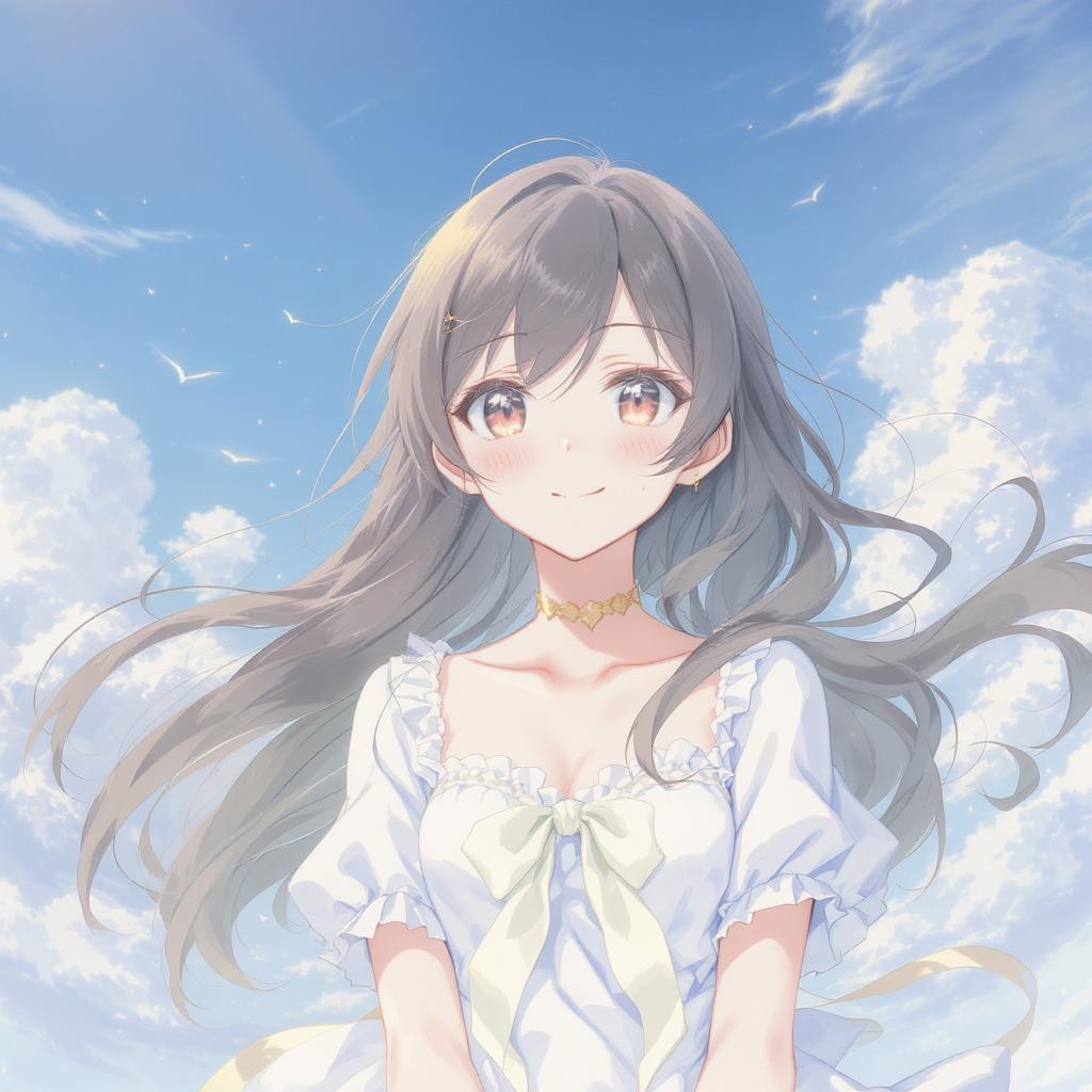 A young girl in delicate attire, captured in the artistic style of Oyari Ashito, set against a vast, clear sky on a bright sunny day. The portrait exudes a sense of calmness and purity, utilizing the captivating aesthetics of manga and anime art. The image is rendered with impeccable attention to detail and quality, presenting in a first-person perspective. Subtle light tones pervade the scene, enhanced by natural lighting and soft clouds drifting in the background, lending a gentle, ethereal glow to the composition.