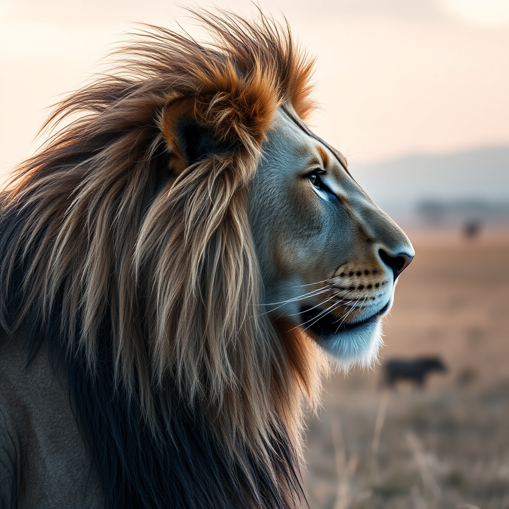 3d photorealistic image, majestic side profile of a lion on the Serengeti, detailed extreme close-up, inspired by Frans Lanting’s style, captured using a Canon EOS R3 with a 70-200mm lens, occupying the entire frame, ultra high-resolution, aspect ratio 1:2, stylized with a touch of creative flair for heightened natural beauty.