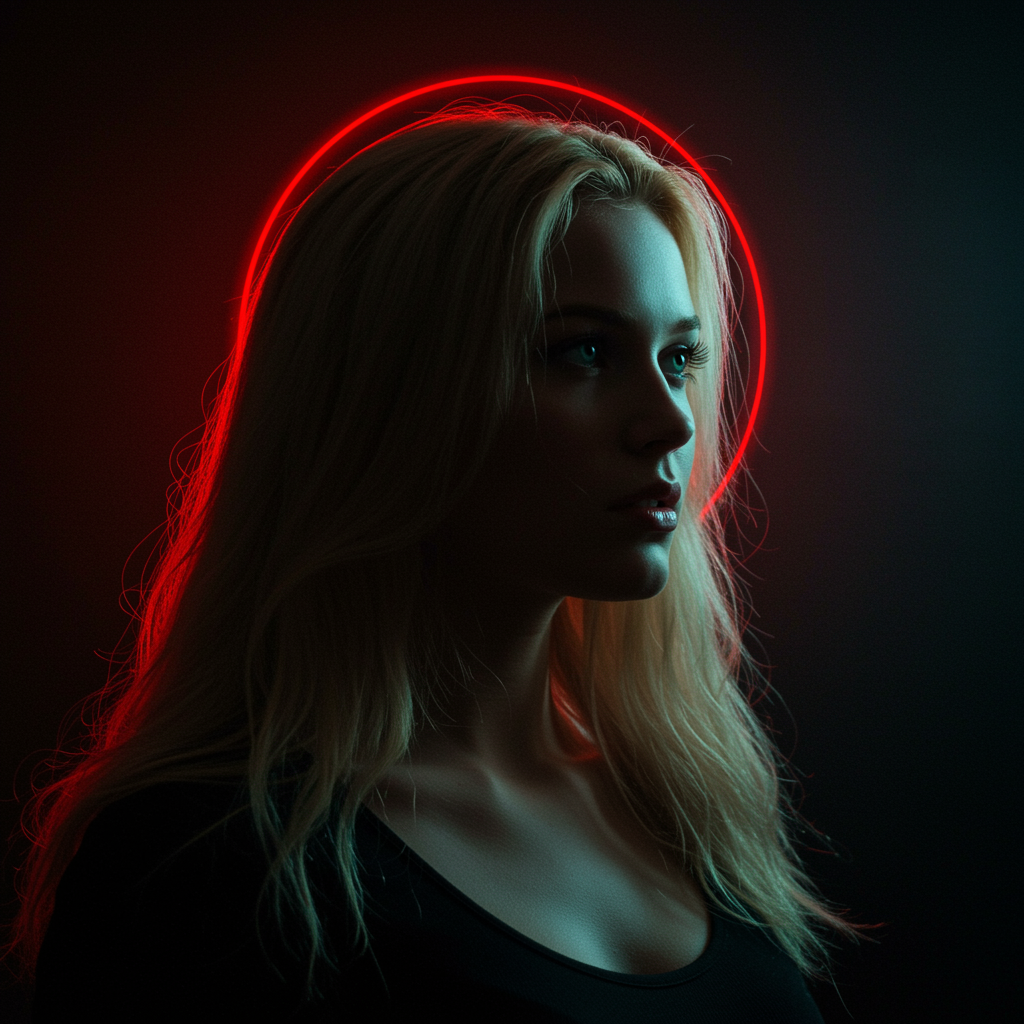 Majestic image of a blonde woman captured in a melainotype style, featuring cinematic lighting reminiscent of a masterful Unreal Engine 5 sequence. This cinematic moment, crafted through expert color grading, has the finesse of an editorial photoshoot, shot with a 70mm lens that contributes to a captivating depth of field, utilizing tilt blur and precision shutter speed of 1/1000 at an f-stop of F/22. The piece boasts a white balance set at 32k and super-resolution technology to achieve a breathtaking megapixel clarity in ProPhoto RGB. Incorporating VR elements, the composition embodies the excellence of artists like Artgerm and Alex Ross, showcasing her in strong, halfrear lighting balanced with natural backlight and incandescent tones. The setting bathes the subject in moody and cinematic light patterns, enhanced by both studio and soft lighting techniques, creating a volumetric, contre-jour effect. Subtle yet dramatic dark lighting plays against accent lights, enhanced by global illumination and state-of-the-art ray tracing technology. A red rim light adds a dramatic touch, with the coloring meticulously balanced to a cool 45%, highlighting her features with precision optics and light scattering, creating an ethereal glow. Shadows are rough yet shimmering, contributing to ray-traced reflections, and captured through advanced scan line techniques enabled by ray tracing reflections, Lumen reflections, and screen space reflections. Diffraction grading and chromatic aberration ensure mesmerizing visual depth, further enhanced by GB displacement and ray tracing ambient occlusion. Anti-aliasing techniques like FKAA, TXAA, and RTX are employed, alongside SSAO, with shader intricacies presented through OpenGL and GLSL methods. Post-processing, including cel shading and tone mapping, combines with advanced CGI, VFX, and SFX for an insanely detailed composition that is hypermaximalist yet elegant. The image's hyper-realistic and super-detailed finish is emphasized by a dynamic pose, perfectly centered, conveying the epitome of artistic photography.