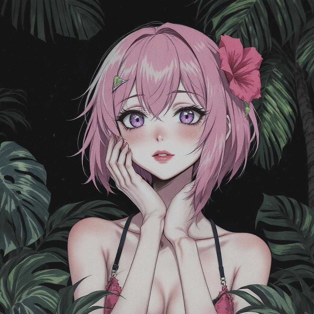 a portrait of a self-absorbed girl in a tropical setting, expressive face, seductive, anime style, comic illustration, high resolution, textured, dark background, subdued palette, digital artwork, highly detailed, text overlay, low quality artifacts, unrefined, duplicated elements, unsettling, distorted, clumsy depiction of hands, distorted facial features, mutation, fuzzy, parched, flawed proportions, extra appendages, replicated face, warped, exaggerated features, misshapen limbs, absent arms, missing legs, additional arms, additional legs, elongated neck, photographic elements, signature, watermark, emblem, autograph, brand mark, obscured, improperly rendered anatomy, disproportionate body, flawed facial structure, imperfect dentition, anomalies.