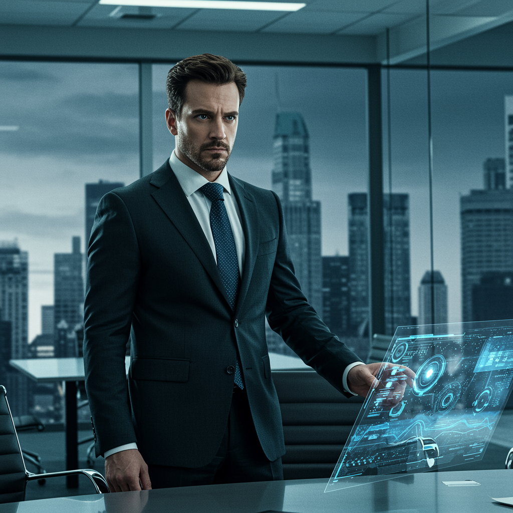 A determined businessman with a striking resemblance to Ironman, stands confidently in a sleek, modern office. The dramatic lighting casts sharp shadows across his face, highlighting his sharp features and intense gaze. His impeccably tailored suit reflects his entrepreneurial success, exuding an air of sophistication and power. In the background, a skyline of skyscrapers looms, symbolizing his vast corporate empire. He glances at cutting-edge technologies displayed on a sleek conference table, hinting at his innovative mind and visionary ideas.
