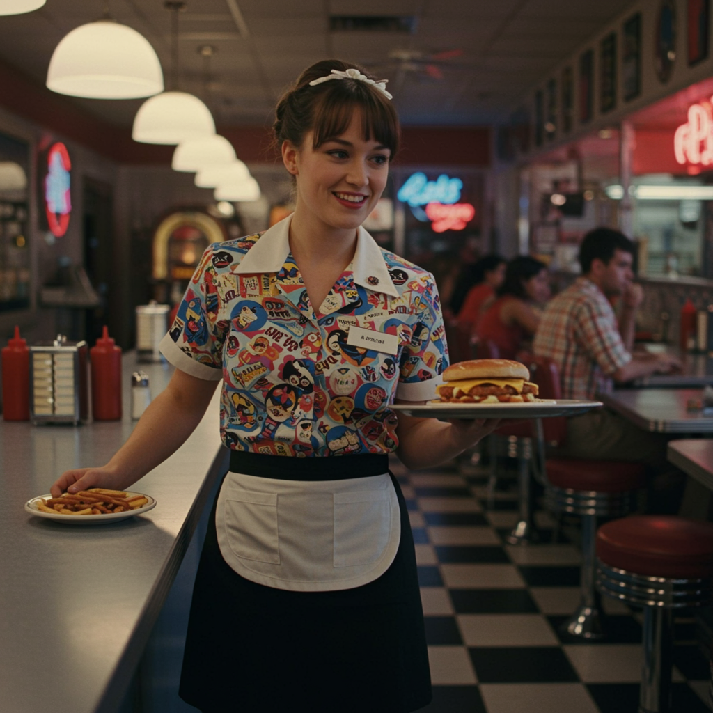 A waitress expertly serves food at a retro 1980's-style diner, her uniform adorned with vibrant patterns reminiscent of the era. The scene is captured in hyper-realistic, photo-realistic detail, showcasing the textures and colors of the vintage decor. The setting is brought to life in high resolution, highlighting the gleaming chrome countertops and checkered floor tiles. The studio photoshoot quality emphasizes depth of field, with the foreground sharply focused on the waitress's warm smile and confident composure while the background softly blurs to reveal silhouettes of classic jukeboxes and neon signage.