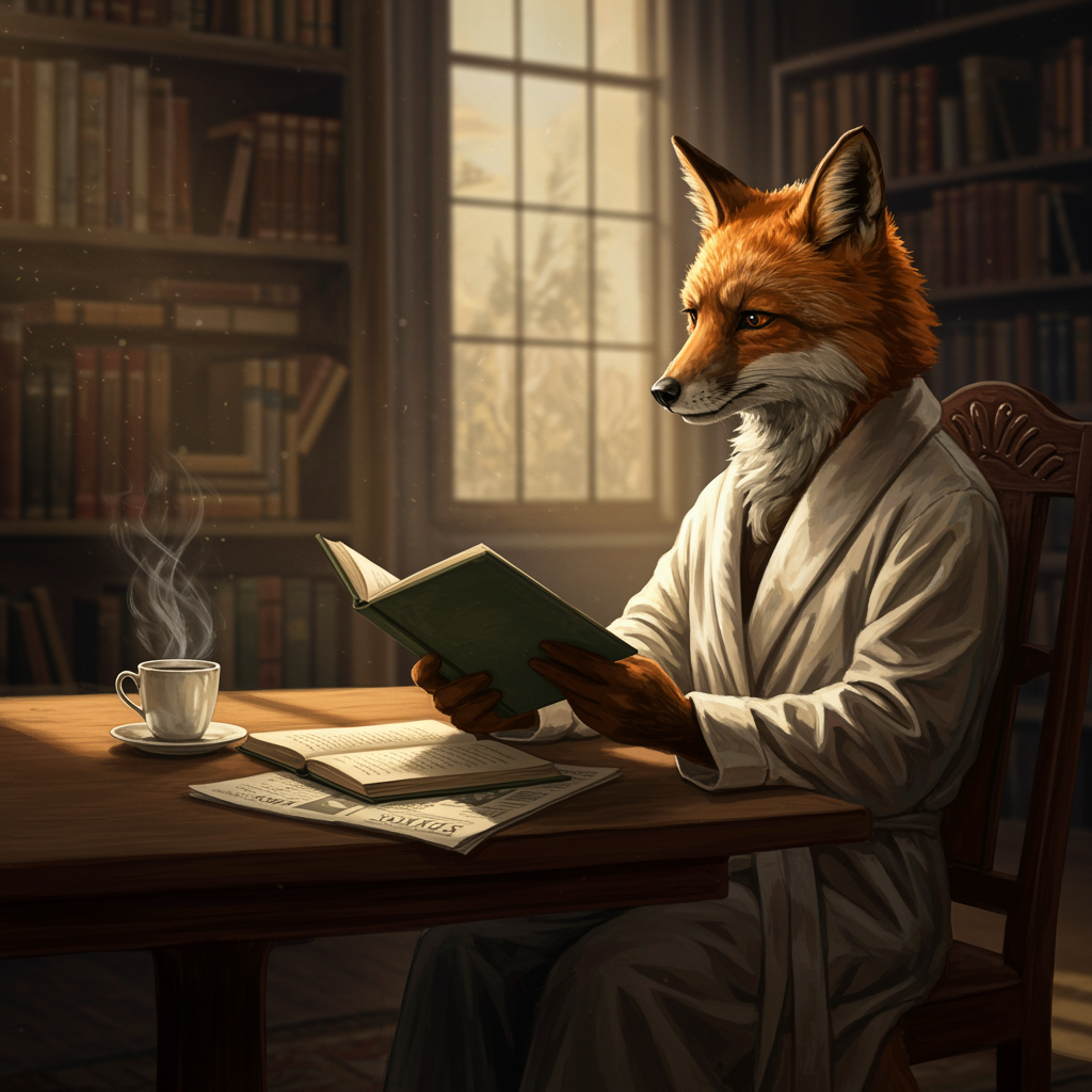An anthropomorphic fox sits at a table in a dusty library, immersed in a book while dressed in an elegant robe. Sunlight streams softly through the windows, casting a warm glow over the scene in what appears to be a late morning. A steaming cup of coffee rests nearby, next to a folded newspaper. The fox's cinematic outfit adds a touch of sophistication, as if captured in an old-world, classic portrait.