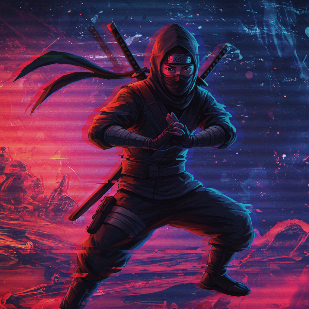 A stealthy ninja emerges from the shadows, illustrated with vibrant, distorted colors reminiscent of Takeshi Murata’s glitch art, set against a backdrop of surreal digital landscapes. The figure is dynamically posed, their silhouette blending seamlessly with swirling patterns of light and color that evoke a sense of motion and energy. The scene is elongated, emphasizing the ninja’s sleek, enigmatic form as they navigate an abstract world where reality blurs into a digital dream. Shadows play across their face, cloaking their identity in mystery, while their eyes shine with a piercing, otherworldly clarity. The atmosphere is charged with both tension and fluidity, encapsulating the enigmatic and futuristic essence of a ninja in an era of digital art.