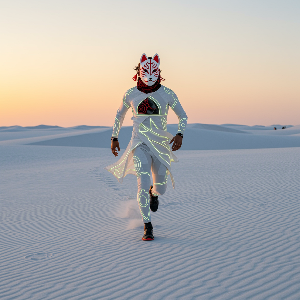 In a striking scene, a man dashes dynamically towards the camera across the pristine expanse of a white sand desert. His face is obscured by a traditional kitsune mask, the fox spirit’s characteristics accentuated with vibrant red and black tribal patterns. The man’s attire blends the supernatural with the futuristic; a flowing white suit echoes the sleekness of a speed racer while intricate, subtly glowing lines trace patterns across the fabric, reminiscent of ancient folklore interwoven with modern technology. The setting sun casts long shadows and bathes the landscape in a spectrum of warm hues, enhancing the dreamy atmosphere. The overall scene evokes a sense of awe as the viewer is drawn into this mysterious fusion of cultures and times, with bright, surreal colors creating an almost ethereal sensation.