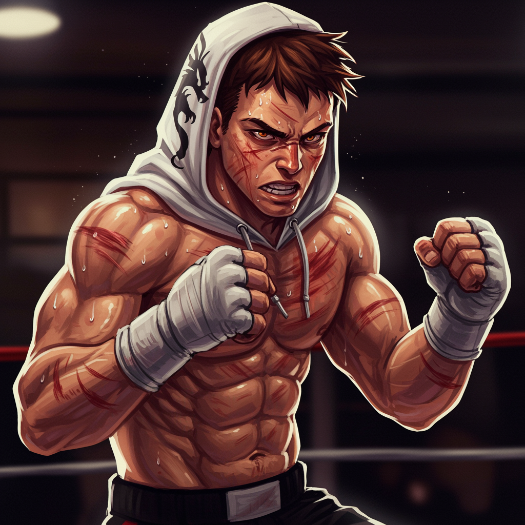 In the style of Prokoko, illustrate a muscular young man with short brown hair, exuding a tough and intense gaze, and possessing strong, calloused hands. He's clad in a white dragon hoodie, embodying the essence of a seasoned fighter with scars and marks from battles etched across his face and body. Captured mid-action in a dynamic, epic pose, sweat beads on his skin, implying speed and momentum, with a blur effect enhancing the scene. The backdrop is a dark boxing club, suggesting he's in the throes of a fierce battle. The piece utilizes bold, expressive brushstrokes and vivid colors, with a focus on CarnageStyle, emphasizing a blood_red palette at an intensity of 1.6. The lighting is cinematic, with a dynamic angle and extreme attention to detail, allowing for minor creative deviations while maintaining the core concept.
