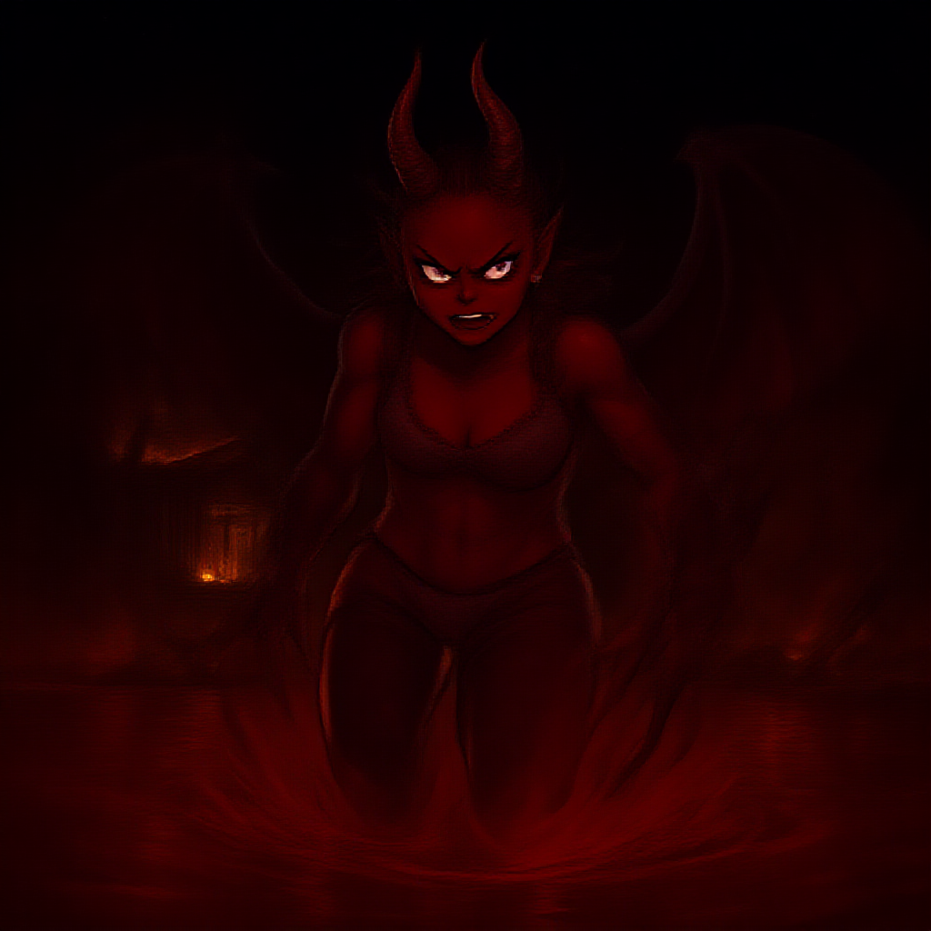 A red-skinned demon girl with wooly underpants and twisted horns, depicted in the style reminiscent of yuumei, featuring anime and manga graphics. She wears stockings and exudes an aura of gigantism, with demon wings ominously present in the background. The scene is set over a red, reflective water surface, with the backdrop of a house engulfed in flames. The image is intricately detailed, capturing elements in hyper detail, conveying a sense of acceleration and speed with dark exposure. Presented from a third-person perspective, viewed from a lower angle, the composition is designed with ambient lighting in mind, achieving the highest quality and detail, rendered in 8K Ultra-HD against a night sky teeming with hints of nightlight.