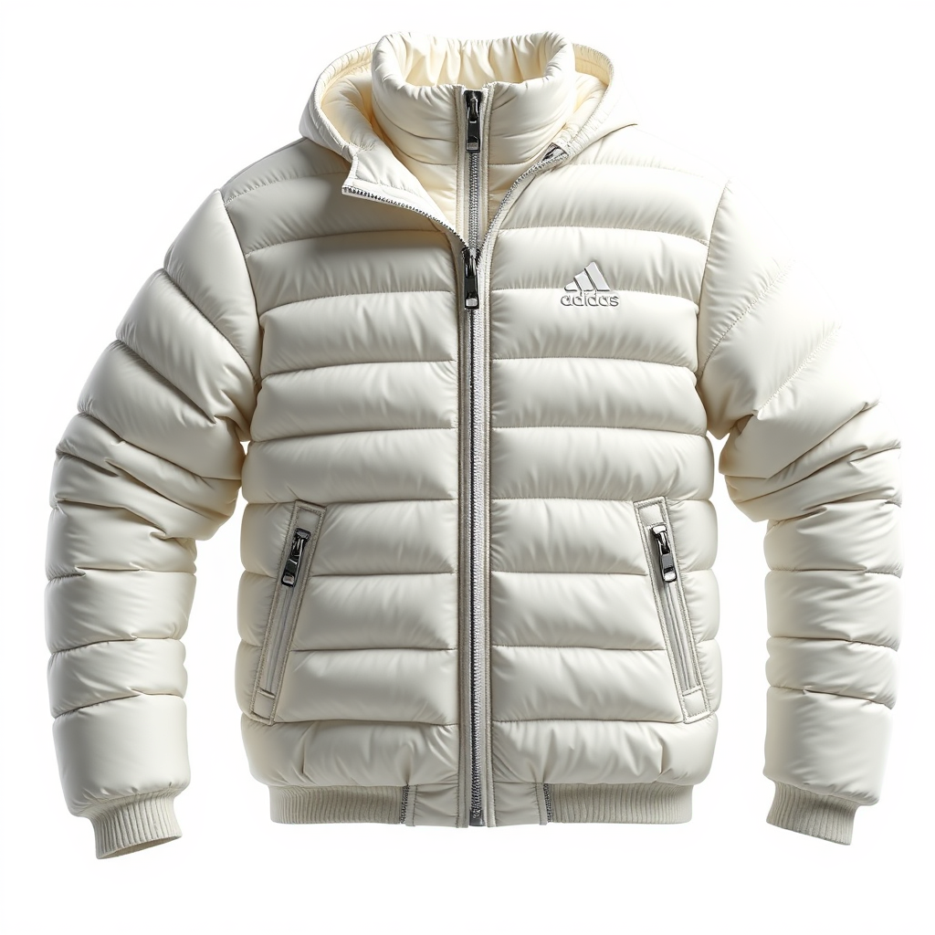 Milky white Adidas winter puffer jacket featuring a design trend influenced by Kanye West, displayed on a pristine white background. The jacket boasts intricate and detailed textures, captured with an octane render in 4K resolution, offering a modern and sleek aesthetic. Subtle creative modifications include unique zipper pulls and embossed patterns for added visual interest.