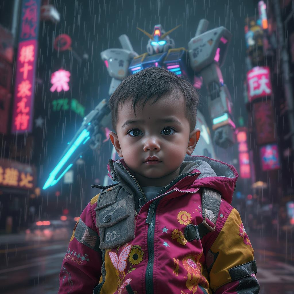 Coatl full body portrait of a small child in a vibrant cyberpunk setting, set against a backdrop featuring a towering gundam amidst a blurred, bustling cityscape. The scene is rendered in ultra-high definition with 8k detail, utilizing the power of octane render and the unreal engine to deliver a strikingly realistic and detailed masterpiece. The artwork channels the aesthetics of high-concept artstation visuals, with sharp, intricate details that adhere to the rule of thirds, capturing the viewer's attention with a captivating blend of imagination and realism.