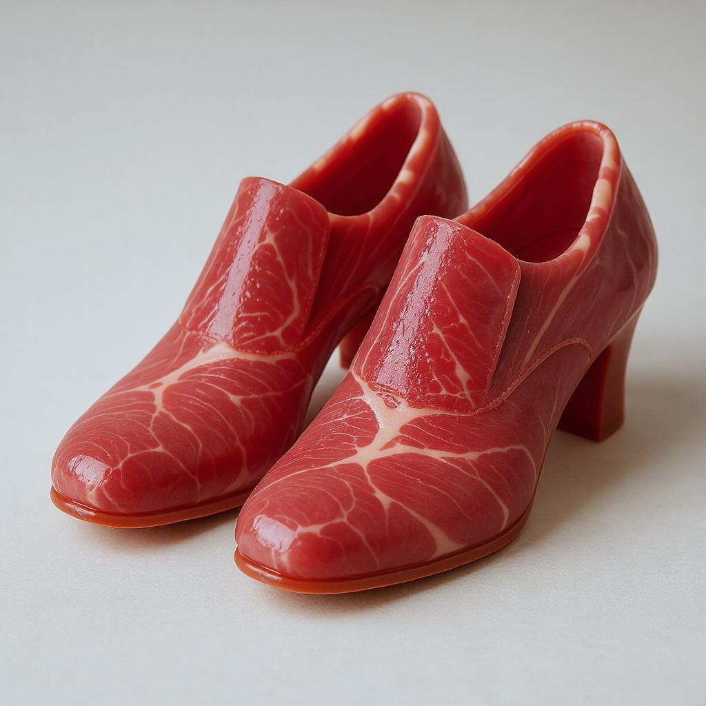 A whimsical pair of surreal shoes crafted from glossy, vibrant cuts of raw meat, arranged with the artistry of food product photography. The shoes exhibit a playful fusion of textures, with marbled patterns and glistening surfaces, evoking a sense of both luxury and absurdity.