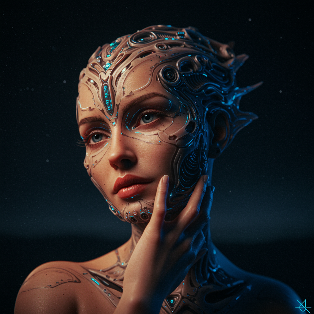 Ultra detailed artistic photography, midnight aura, enchanting night sky, exquisitely detailed face, ethereal, soft glow, backlit elegance, subtle glamour, shimmering shadows, oil on canvas elegance, delicate brush strokes, smooth texture, ultra high definition, 8k, captivating focus, art by Alberto Seveso, Artgerm, Loish, science fiction essence, intricate masterpiece, mystical allure, matte painting style, golden ratio composition, trending on CGSociety, elaborate and epic, featured on ArtStation, inspired by Artgerm, H. R. Giger and Beksinski, vibrant cinematic render, ultra high-quality CGI model, 3D beauty, Octane render.