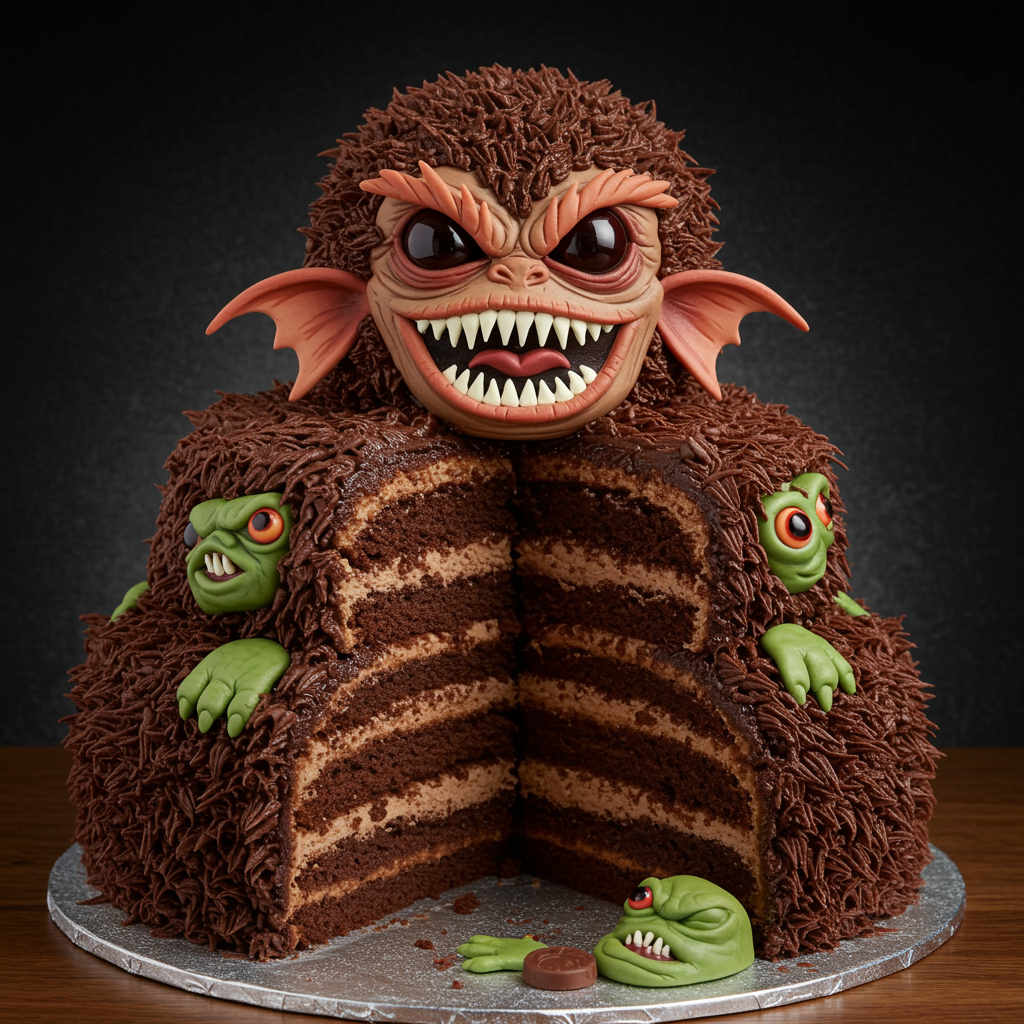 Creepy critters craze:: sinister bite:: cake creation with devious charm, inspired by critters movie:: layers of chaos enveloped in dark humor:: edible mischief awaits in every slice