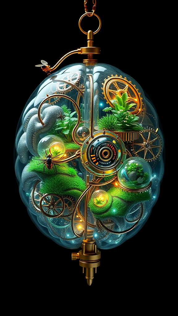 A 3D render of a sci-fi baroque concept design featuring an anatomically correct brain device, intricately integrated with a terrarium. This steampunk masterpiece showcases scientific precision with hyper-detailed components, including brass gears and glass tubes interwoven throughout the brain structure. The terrarium houses miniature ecosystems, with tiny plants and intricate landscapes nestled within the folds of the brain. Delicate clockwork mechanisms and glowing LED-like elements imbue the design with a photorealistic quality, reflecting light and shadows in mesmerizing patterns, while small, fluttering mechanical insects inhabit the complex interior, adding a touch of whimsy to the scientifically grounded creation.