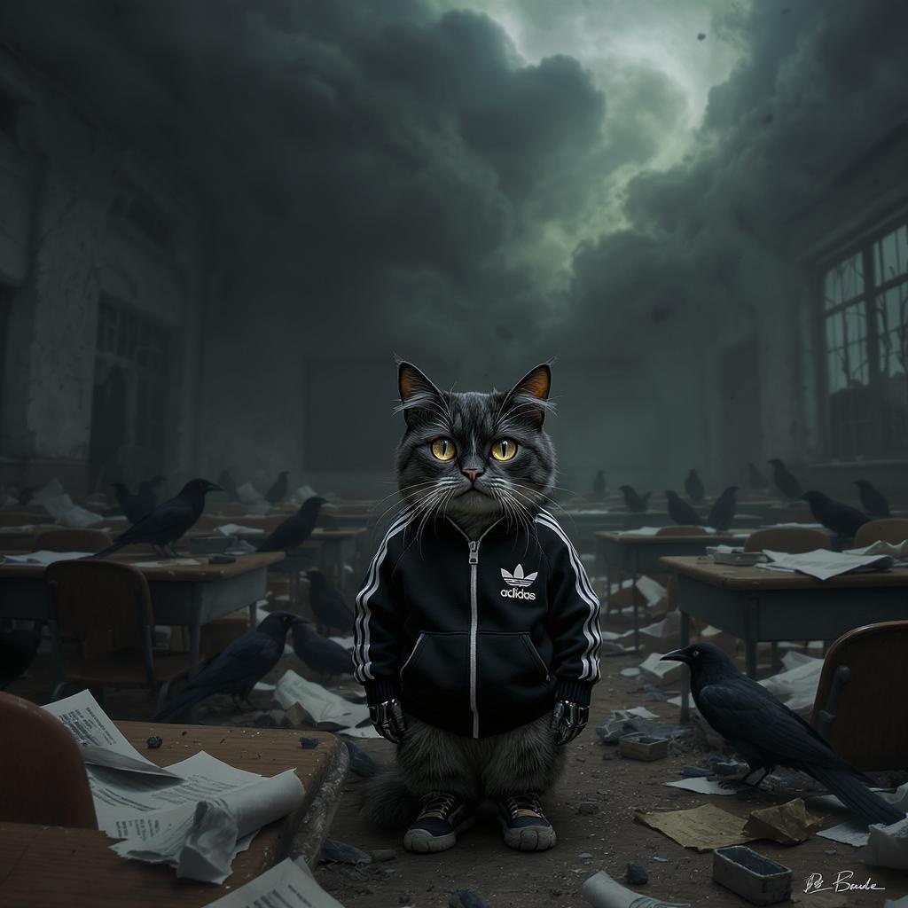 A hyper-realistic scene unfolds, featuring an anthropomorphic, cybernetic cat exuding cuteness as it sports an Adidas jacket and sneakers. The atmosphere is unsettling, as crows gather around in a damaged classroom filled with disordered tables and chairs. Above, a beautiful yet eerie sky casts a haunting glow, blending shades of gray and green in a fantasy-like setting. The scene embodies a sense of horror with its creepy, ominous undertones. Captured in an ultrawide, cinematic frame, the intricacies of the scene are hyper detailed, embracing a hyper maximalist style while subtly incorporating the golden ratio to draw the eye.