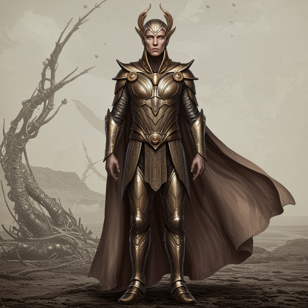 A surreal male character design inspired by the movie Krull, blending the artistic styles of Sergio Toppi and George Barbier, featuring sci-fi motifs with a focus on hyperrealism and minimalism, showcasing a photorealistic approach. The character embodies the essence of rebelcore, with an avant-garde, otherworldly appearance. He wears an intricately detailed futuristic armor with elegant Art Deco patterns, complemented by an ethereal flowing cape. His face combines hyperrealistic features with minimalistic embellishments, highlighting expressive eyes that project both wisdom and defiance. The backdrop is a stark, surreal landscape, merging organic and mechanical elements, reflecting a raw and unpolished aesthetic.
