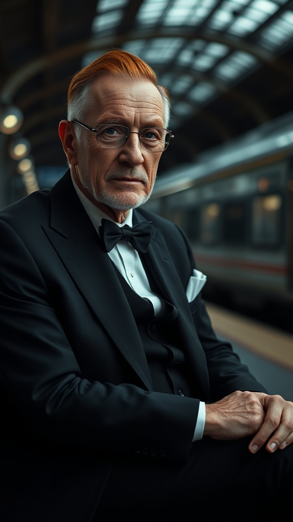 An elderly man is sitting at the train station, elegantly dressed in a black tuxedo paired with black business trousers. His short stubble and straight, manly features accentuate a beautifully structured face. With warm brown eyes and striking red hair, he possesses a smooth nose and thin lips, while his hair remains neatly styled. The setting is captured in muted tones through professional, high-resolution photography, with an emphasis on soft natural lighting. Composed with an 85 mm lens, the image displays magic photography elements, dramatic lighting, and photorealistic detail. The intimate portrait composition features exquisite bokeh, enhanced by precise color correction reminiscent of Cinestill 800T film. The atmosphere remains mysterious and slightly mystical, with a focus on authenticity and excessive detail, conveying the subject’s grace and wisdom.
