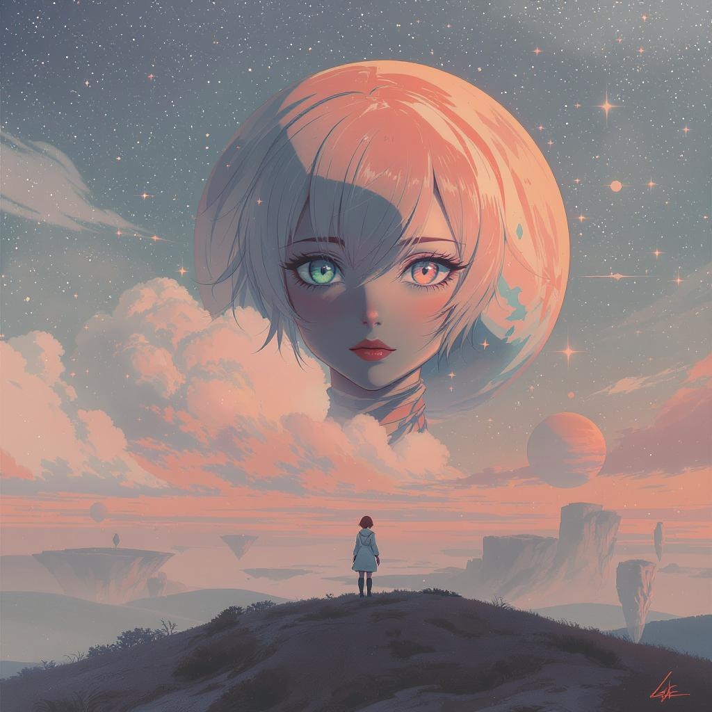 Space girl standing alone on a hill, centered with a detailed, gorgeous face in anime style. A key visual with intricate, highly detailed features that are breathtaking and vibrant. The panoramic and cinematic scene takes inspiration from the works of Carne Griffiths, Conrad Roset, and Studio Ghibli, capturing an ethereal and captivating essence.