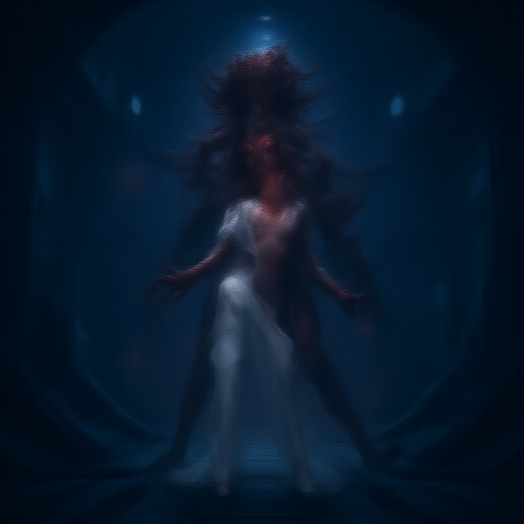 Tsutomu Nihei-inspired style, young girl in a sleek white sci-fi jumpsuit, cyberpunk aesthetic, flowing hair, inside a futuristic spaceship with a cold, metallic ambiance. The room feels expansive and otherworldly, with a sense of gigantism, defined by muted colors and blue luminescence contrasted by bright, concentrated light from one direction. The environment is intricately detailed with sharp angles, creating dynamic, multi-layered spaces that cast dramatic shadows. The atmosphere is imbued with a sense of artistic graphics akin to anime, emphasizing hyper-detail with clusters of glowing energy and flashes of light. The perspective captures a third-person portrait with round illumination and elements, drawing attention to a duality theme. Exploring themes of red, deformed anatomy, and mutated forms, the scene presents a fusion of two figures with disfigured features and distorted proportions, creating a totemic appearance with severed limbs and folded torsos. The environment's details blur into a harmonious yet unsettling futuristic style, punctuated by distorted, floating elements. The girl’s cold expression complements the sci-fi setting, with round windows providing glimpses of the vastness outside.