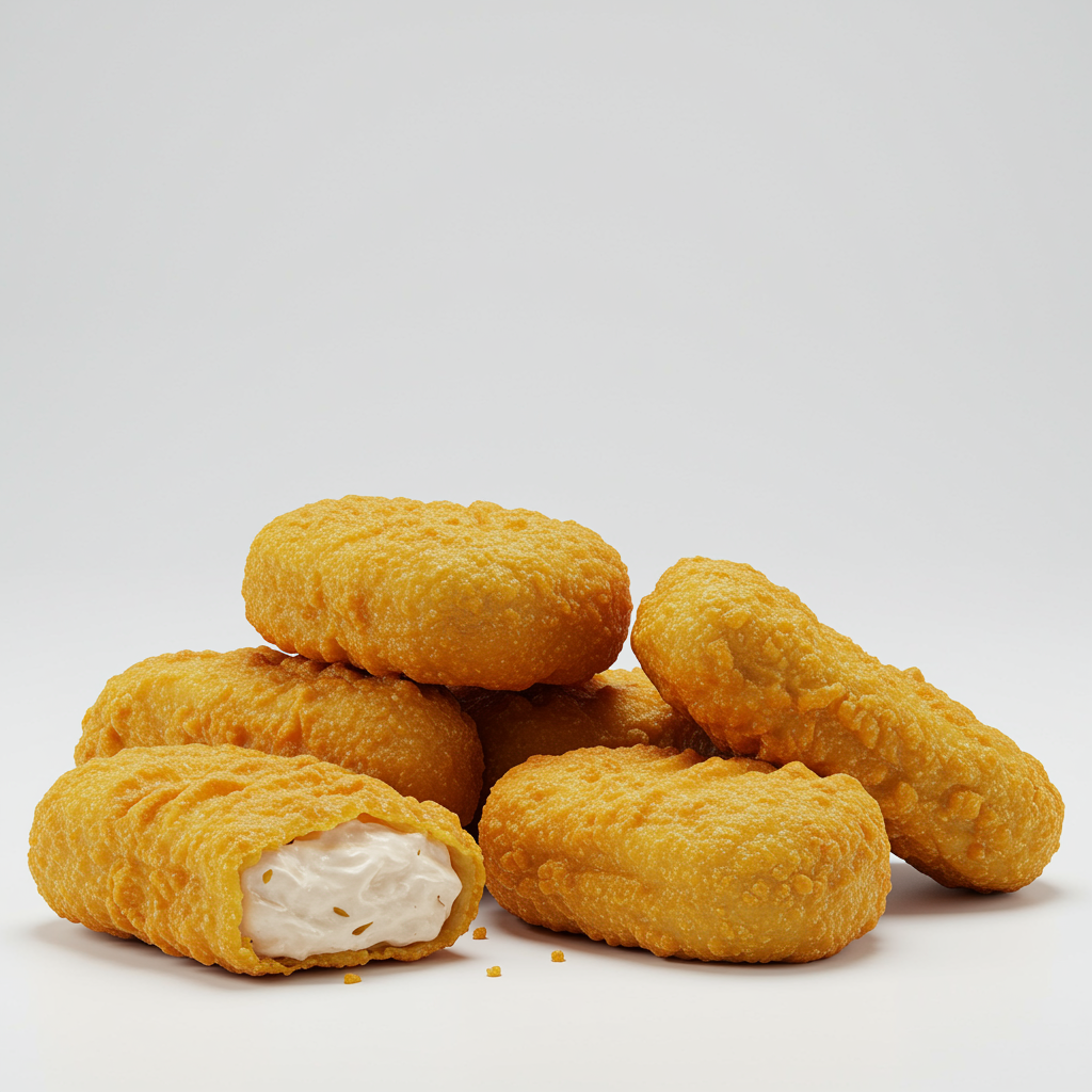 High-resolution commercial photography of chicken nuggets under pristine white studio lighting, captured in ultra-realistic detail and hyperrealism, showcasing every fine texture. Rendered in 8k octane quality with professional color grading. Set against a minimalistic white background, embodying the essence of a polished stock photo. The composition maintains an aspect ratio of 9:16, elevating the visual appeal through slight creative enhancements.