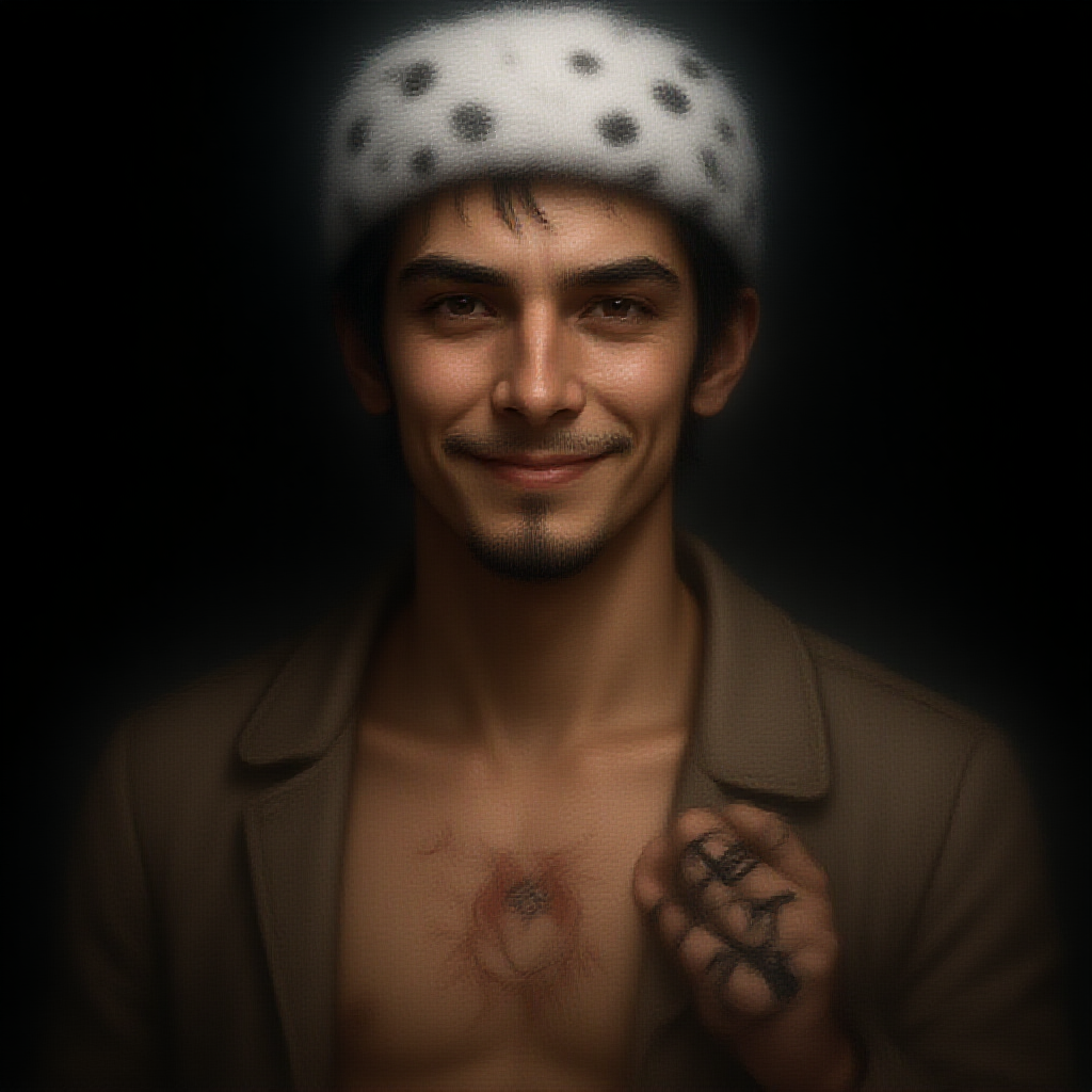 Trafalgar D. Water Law from One Piece anime, depicted as a hyper-realistic, ultra-detailed portrait of a slim young man with relatively tall stature. He wears an enigmatic smirk and sports a northern-style fur hat, white with a distinctive spotted pattern along the bottom and bill. His short, dark hair and dark sideburns frame a face featuring a small goatee. The back of his fingers are tattooed with the letters D E A T H in bold black ink. On his chest, a tribal-style heart tattoo incorporates his iconic Jolly Roger. The portrait showcases cinematic lighting with high contrast, giving it an artstation character concept art feel in 8K resolution, maintaining the essence while adding slight creative nuances.
