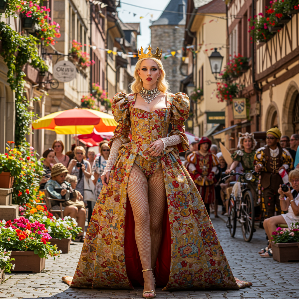 A strikingly elegant and authoritative queen stands amidst a vibrant and colorful festival, clad in intricately designed garments that blend revealing elements with an absurdist flair. Her regal presence commands attention as she navigates through an enchanting setting filled with blooming flowers and grand medieval architecture, all basking in the warmth of a summer street. The scene captures the essence of a high-quality masterpiece, celebrating the harmonious blend of historical grandeur and fantastical whimsy.
