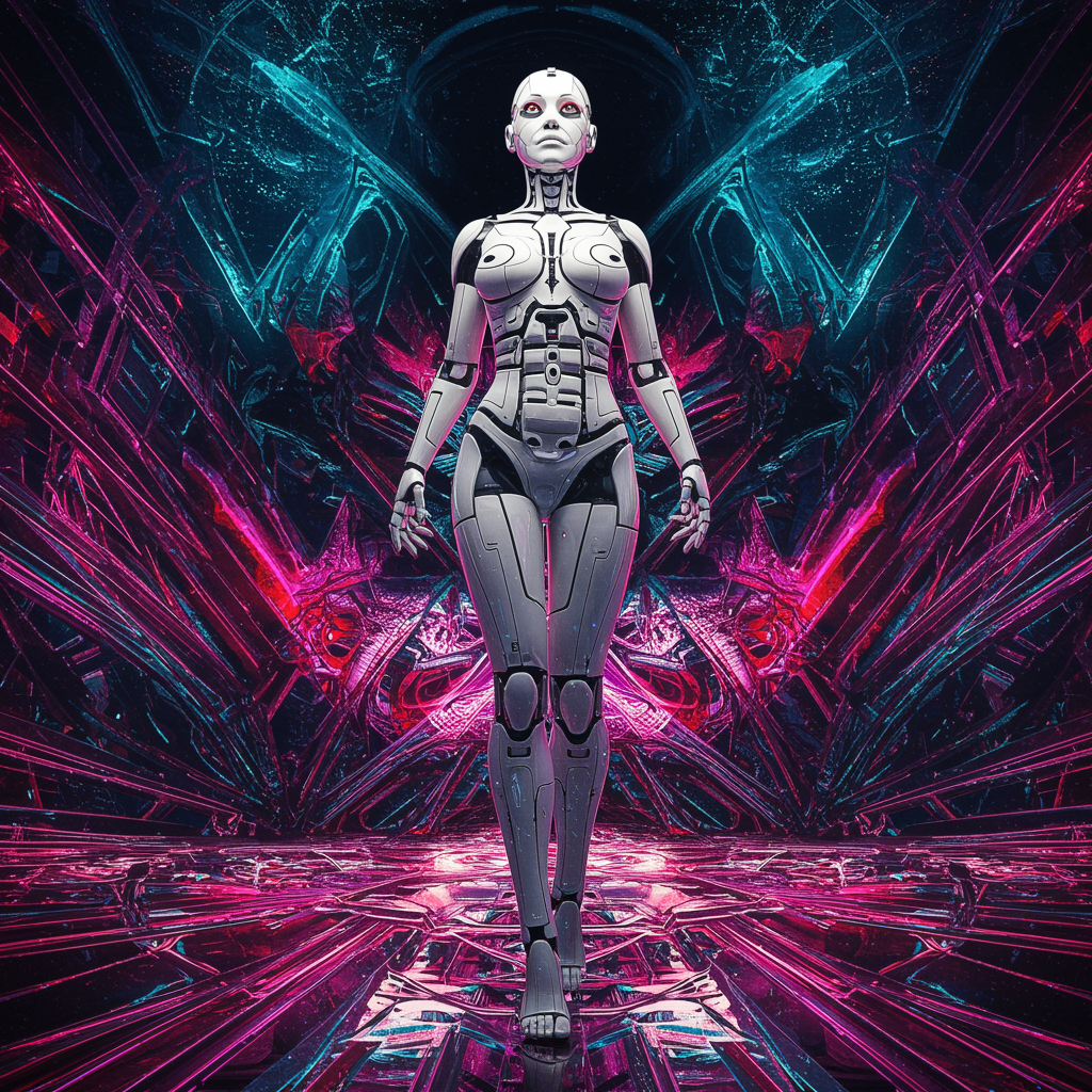A full body photo featuring a stunning model in a super realistic DMT-inspired fashion photoshoot, captivating with eyes wide open. The scene is an abstract digital art piece, infused with white DMT elements, bold colors, and pop art influences. The design showcases intricate patterns and vray tracing, with dynamic zigzags and elegant, emotive poses. The model embodies a robotic expressionism, blending futurism with human emotion, set against a 4:5 aspect ratio backdrop. The atmosphere is one of mesmerizing surrealism, where technology meets artistry in a vivid, imaginative display.