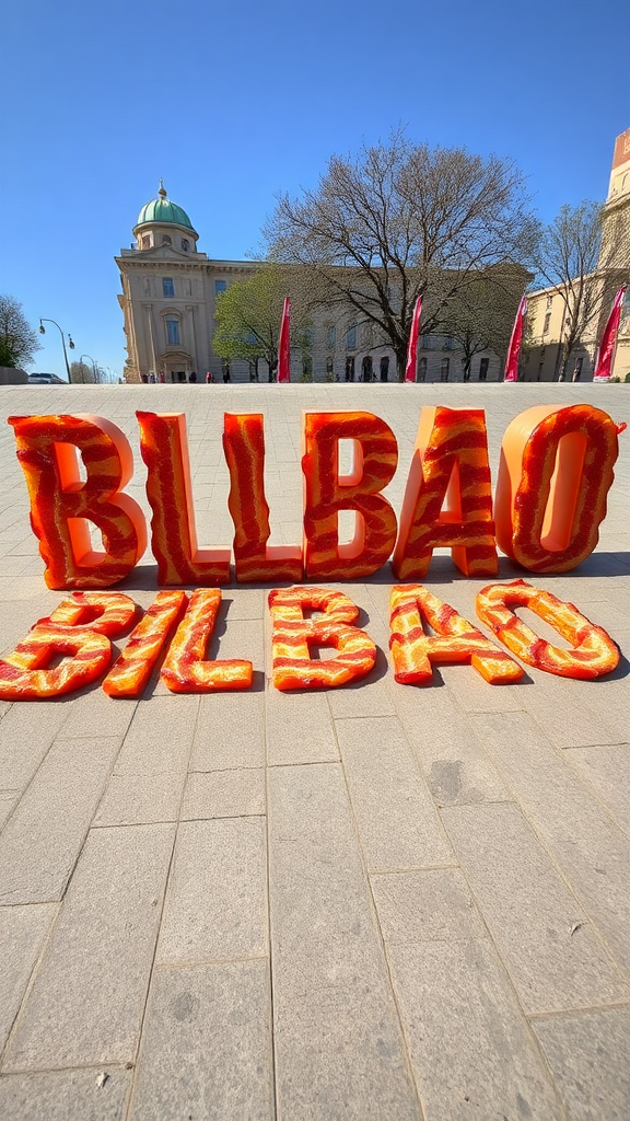 The word "BILBAO" sizzling on the sun-baked pavement, crafted entirely from crispy bacon strips.