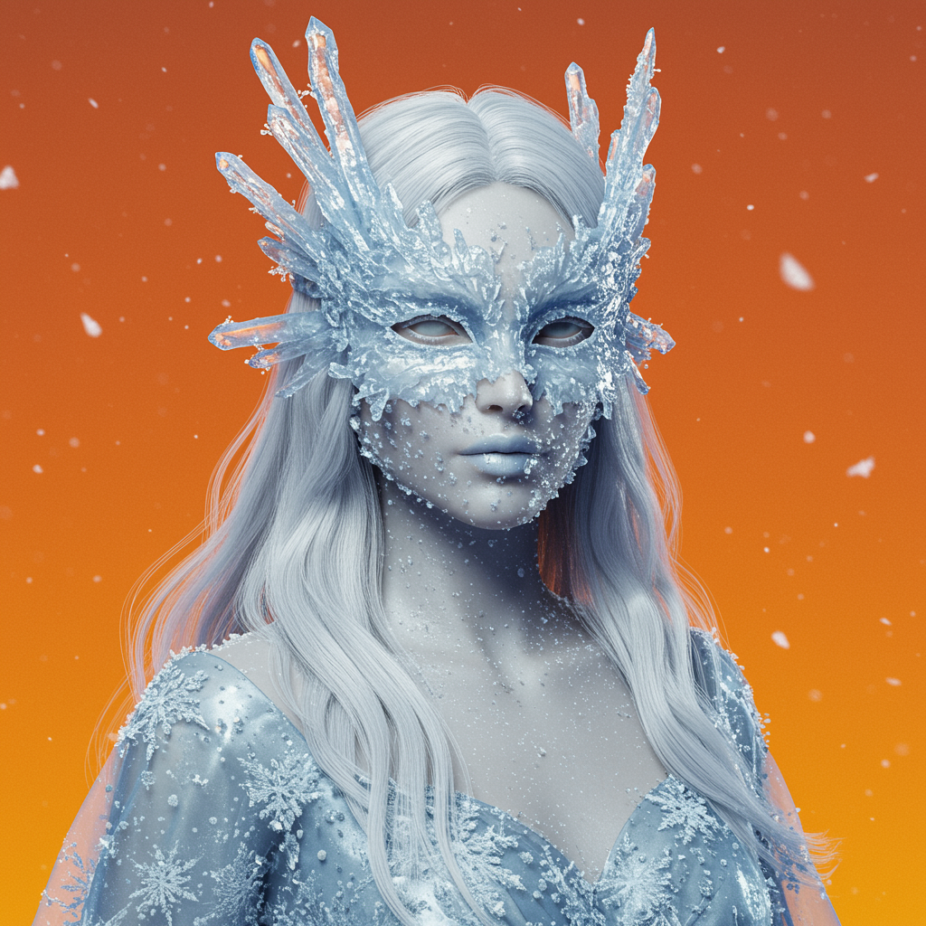 A hyper-realistic portrait, in HD, 8K, of a woman wearing a mask sculpted from shimmering ice and frost. The mask is smooth and translucent, with intricate crystal formations branching asymmetrically along the edges, resembling fractal patterns of frozen water. She wears a flowing gown of luminous silver and pale blue silk, intricately embroidered with delicate snowflake motifs, the fabric sparkling as if dusted with frost. The gown flows as if caught in an eternal, gentle winter breeze, creating an ethereal sense of motion. Her hair, a cascade of silken white waves, glimmers faintly, complementing her pale, porcelain-like skin that exudes a soft, frost-touched glow. The background is a bold sunset orange, offering a surreal contrast to the icy elements of her attire, creating a striking visual harmony that enhances her frozen elegance. Subtle, cold lighting accentuates the translucent details of her mask and the icy shimmer of her gown, enveloping her in an aura of otherworldly magic and pristine winter beauty.