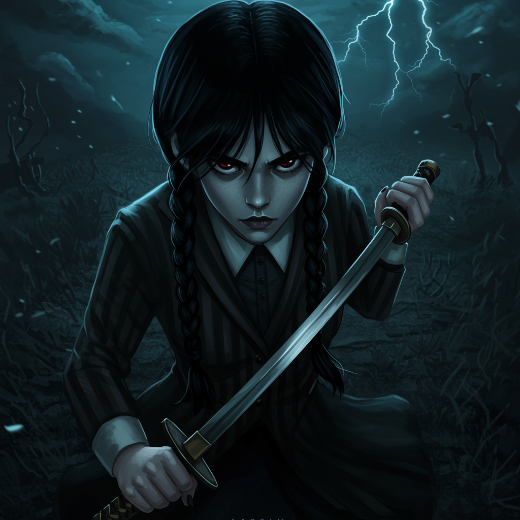 An extremely detailed digital illustration, high resolution, masterpiece, featuring a character with striking black hair and long bangs, captured in a cowboy shot, with intense black eyes staring directly at the viewer. The character wields a short sword in a defiant stance, a grumpy expression accentuating their determined face. The perspective is from above, offering a commanding front view set against a nighttime backdrop. The dark ambient lighting is punctuated by the dramatic flash of lightning, casting dynamic shadows. The overall aesthetic echoes the enigmatic aura of Wednesday Addams, incorporating subtle creative modifications for a unique twist.